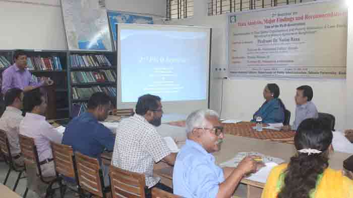 লোক প্রশাসন বিভাগের অধ্যাপক মোহাম্মদ আসাদুজ্জামানের তত্বাবধায়নে একই বিভাগের সহযোগী অধ্যাপক মুন্সী মর্তুজা আলী ‘তৃতীয় শাখা সংগঠনের প্রশাসন ও দারিদ্র্য নিরসন: বাংলাদেশে ক্ষুদ্র ঋণ বিতরণ ব্যবস্থা’ বিষয়ে পিএইচডি গবেষণা করছেন। পিএইচডি গাবেষণার ‘তথ্য বিশ্লেষণ, মূখ্য আবিষ্কার ও সুপারিশ’ বিষয়ে সেমিনার অনুষ্ঠিত হয়।