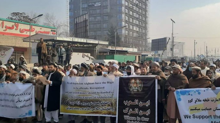 বিক্ষোভকারীরা জানান, আফগান সম্পদের ওপর নিষেধাজ্ঞা আন্তর্জাতিক আইন বিরোধী কাজ এবং আন্তর্জাতিক নীতিমালার লঙ্ঘন।
