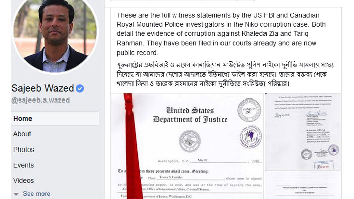 এতে তিনি লিখেছেন, যুক্তরাষ্ট্রের এফবিআই ও রয়েল কানাডিয়ান মাউন্টেড পুলিশ নাইকো দুর্নীতি মামলায় সাক্ষ্য দিয়েছে যা আমাদের দেশের আদালতে ইতোমধ্যে ফাইল করা হয়েছে। তাদের বক্তব্য থেকে খালেদা জিয়া ও তারেক রহমানের নাইকো দুর্নীতিতে সংশ্লিষ্টতা পরিষ্কার। সজীব ওয়াজেদ জয়ের ফেসবুক পেজে এ সংক্রান্ত একটি স্টেটমেন্ট পোস্ট করা হয়।