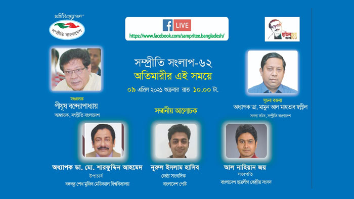 এরই ধারাবাহিকতায় আজ শুক্রবার রাত ১০টায় সম্প্রীতি সংলাপের ৬২তম পর্বে ‘অতিমারীর এই সময়ে’ শীর্ষক সংলাপ অনুষ্ঠিত হবে।