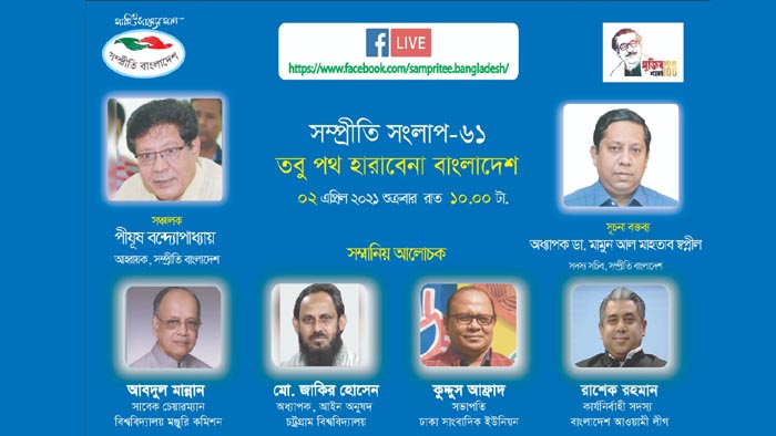 এরই ধারাবাহিকতায় আজ শুক্রবার রাত ১০টায় সম্প্রীতি সংলাপের ৬১তম পর্বে ‘তবু পথ হারাবে না বাংলাদেশ’ শীর্ষক সংলাপ অনুষ্ঠিত হবে।