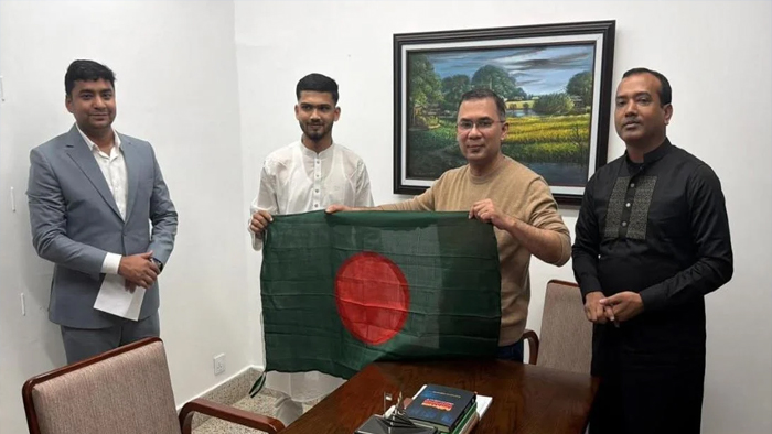 জুলাইয়ে উড়ানো সেই পতাকা তারেক রহমানকে উপহার দিলেন মুত্তাকিন