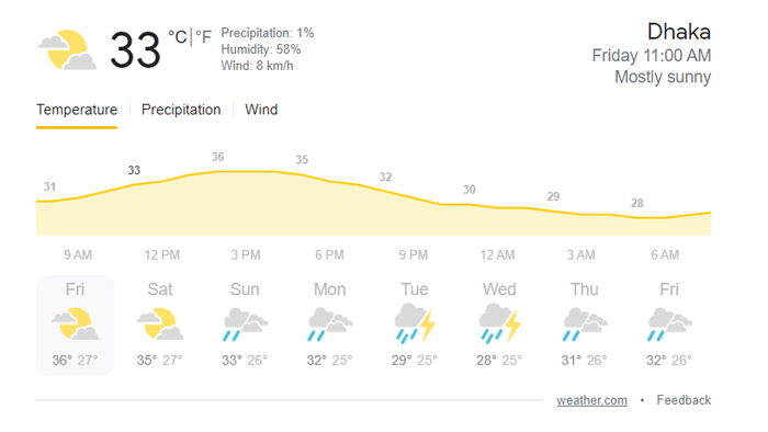 সারাদেশে টানা দুই সপ্তাহ তীব্র গরম বয়ে যাচ্ছে। যদিও বুধবার রাতে দেশের বিভিন্ন স্থানে ঝড়-বৃষ্টি হয়েছে। এর প্রভাবে গতকাল বৃহস্পতিবার সকালে তাপমাত্রা কিছুটা কম ছিলো। আকাশেও ছিল মেঘ। তবে বেলা বাড়ার সঙ্গে সঙ্গে রোদের তেজ বাড়তে থাকে।