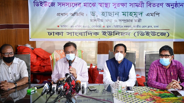 তথ্য ও সম্প্রচার মন্ত্রী ড. হাছান এসময় মহামারির মধ্যে প্রাণের মায়া তুচ্ছ করে অক্লান্ত কাজ করে যাওয়া গণমাধ্যমকর্মীদের ভূয়সী প্রশংসা করেন, আওয়ামী লীগের ত্রাণ ও সমাজকল্যাণ সম্পাদক সুজিত রায় নন্দীকে স্বাস্থ্যসুরক্ষা সামগ্রী সরবরাহের জন্য ও এগুলো বিতরণের উদ্যোগের জন্য ডিইউজে নেতৃবৃন্দকে আন্তরিক ধন্যবাদ জানান।
