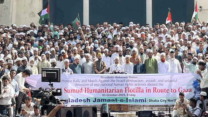 ‘গ্লোবাল সুমুদ ফ্লোটিলা নৌবহরে’ আক্রমণ ও বিশ্বের মানবাধিকার কর্মীদের আটকের প্রতিবাদে বিক্ষোভ মিছিল করেছে বাংলাদেশ জামায়াতে ইসলামী।
