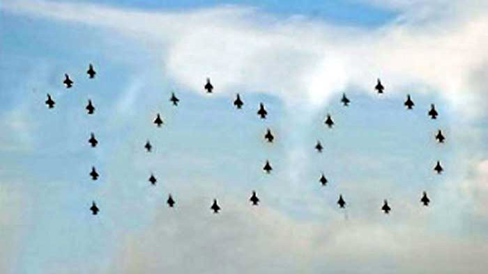 আজ বুধবার (১৭ মার্চ) বিমান বাহিনীর প্রধান এয়ার চীফ মার্শাল মাসিহুজ্জামান সেরনিয়াবাতের (বিবিপি, ওএসপি, এনডিইউ, পিএসসি) দিক নির্দেশনায় দেশের বিভিন্ন স্থানের আকাশে বিমানের মাধ্যমে ১০০ তৈরির এই উড্ডয়ন শৈলী প্রদর্শিত হয়।