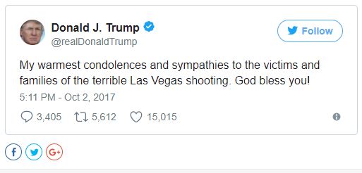 এদিকে এক টুইট বার্তায় লাস ভেগাসের ঘটনায় নিহতদের পরিবারের প্রতি গভীর সমবেদনা জ্ঞাপন করেছেন মার্কিন প্রেসিডেন্ট ডোনাল্ড ট্রাম্প।