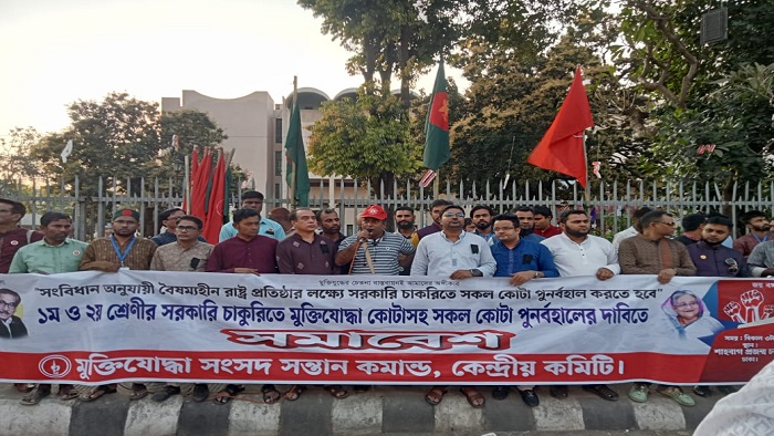 ১ম ও ২য় শ্রেণীর সরকারি চাকরিতে মুক্তিযোদ্ধা কোটাসহ সকল কোটা পুনর্বহালের দাবিতে আজ ১লা মার্চ শুক্রবার বিকাল ৩টায় শাহবাগ জাতীয় জাদুঘরেের সামনে সমাবেশ শেষে ঢাকা বিশ্ববিদ্যালয় ক্যাম্পাসে বিক্ষোভ মিছিল করে মুক্তিযোদ্ধা সংসদ সন্তান কমান্ড, কেন্দ্রীয় কমিটি। সংগঠনের সাধারণ সম্পাদক আল মামুন এর সঞ্চালনায় উক্ত সমাবেশে সভাপতিত্ব করেন সংগঠনের সভাপতি মাহবুবুল ইসলাম প্রিন্স। সমাবেশে সংহতি প্রকাশ করেন মুক্তিযুদ্ধ মঞ্চ, কেন্দ্রীয় কমিটির সভাপতি আমিনুল ইসলাম বুলবুল। নারী কোটার পক্ষে বক্তব্য রাখেন ঢাকা বিশ্ববিদ্যালয়ের শিক্ষার্থী কানিজ ফাতেমা, জেলা কোটার দাবিতে বক্তব্য রাখেন ফিরোজ আহমেদ সুজন, মুক্তিযোদ্ধা কোটার দাবিতে বক্তব্য রাখেন বিভিন্ন জেলা থেকে আগত সংগঠনের নেতৃবৃন্দ। সমাবেশের শুরুতে বেইলী রোডের অগ্নিকাণ্ডে নিহতদের স্মরণে কালো ব্যাজ ধারণ করে এক মিনিট নীরবতা পালন করা হয়।