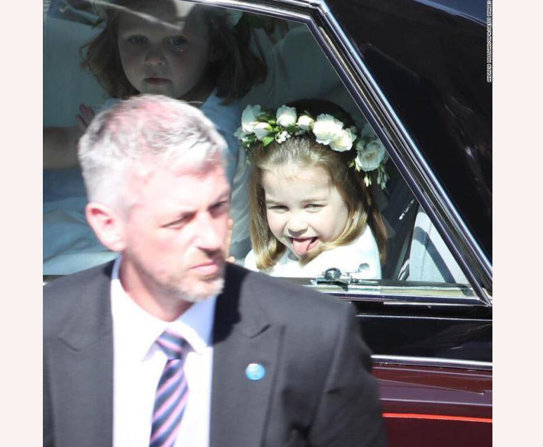 প্রিন্স উইলিয়াম ও কেট মিডলটনের তিন বছর বয়সী মেয়ে প্রিন্সেস শার্লট। হ্যারি-মেগানের বিয়েতে সব ক্যামেরাতেই ধরা পড়েছে এই খুদে প্রিন্সেসের নানা দুষ্টু-মিষ্টি অভিব্যক্তি। অনুষ্ঠানস্থলে পৌঁছানোর পর গাড়িতে বসেই জিব বের করে ভেংচি কাটে শার্লট। ছিল আরও নানা অঙ্গভঙ্গি। ইন্টারনেটের দুনিয়ায় এখন ভাইরাল এসব ছবি।