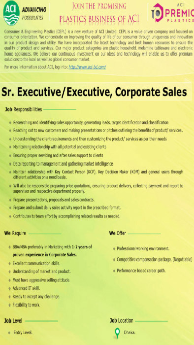 এসিআই লিমিটেড নিয়োগ বিজ্ঞপ্তি প্রকাশ করেছে। প্রতিষ্ঠানটি সিনিয়র এক্সিকিউটিভ অথবা এক্সিকিউটিভ, করপোরেট সেলস পদে নিয়োগ দেবে। আগ্রহ ও যোগ্যতা থাকলে আপনিও আবেদন করতে পারেন।