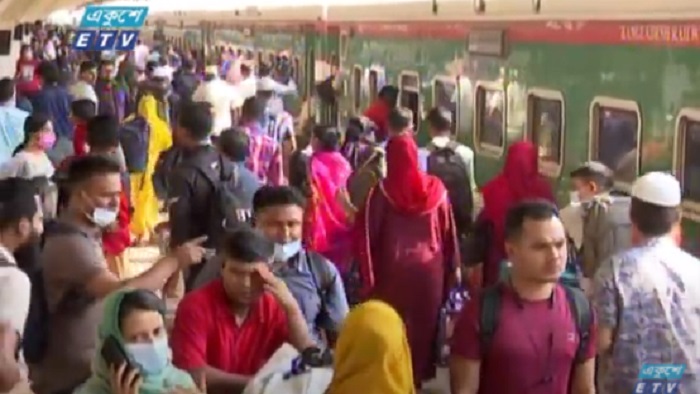 স্বজনদের সাথে ঈদ আনন্দে শামিল হতে এই ছুটে চলা। কমলাপুর রেলস্টেশন থেকে বিভিন্ন ট্রেনে বাড়ি ফিরছেন মানুষ।