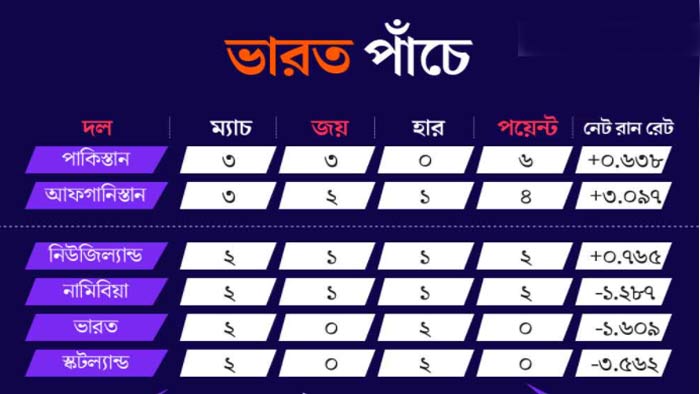 তিনটি ম্যাচ খেলে তিনটিতেই জিতে থাকা পাকিস্তানের আর ম্যাচ বাকি নামিবিয়া (২ নভেম্বর) ও স্কটল্যান্ডের (৭ নভেম্বর) সঙ্গে। পাকিস্তান সবকটি ম্যাচ জিতে ১০ পয়েন্টে শেষ করবে বলেই ধরে নেওয়া যায়।