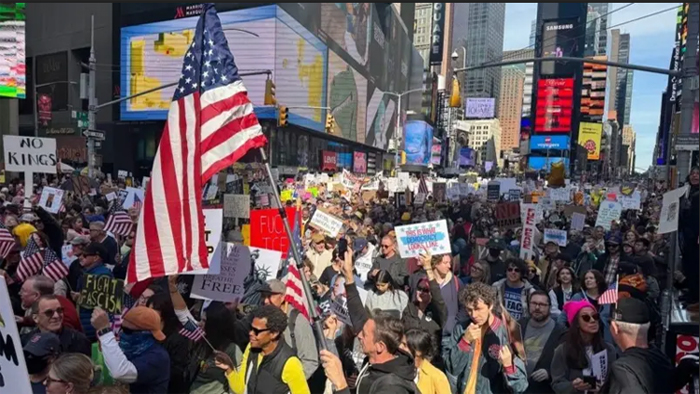 নিউইয়র্কের বিখ্যাত টাইমস স্কয়ারে সকালে শুরু হওয়া সমাবেশে মুহূর্তের মধ্যেই হাজার হাজার মানুষ জড়ো হয়। পুরো এলাকা প্ল্যাকার্ড, ব্যানার ও স্লোগানে মুখরিত হয়ে ওঠে। বিক্ষোভকারীদের হাতে ধরা প্ল্যাকার্ডে লেখা ছিল- ‘ডেমোক্রেসি নট মনার্কি’ (গণতন্ত্র, রাজতন্ত্র নয়) এবং ‘দ্য কনস্টিটিউশন ইজ নট অপশনাল’ (সংবিধানকে উপেক্ষা করা যাবে না)।